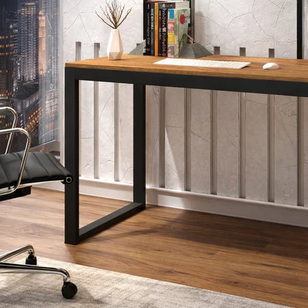 A combinação da estrutura metálica preta com o acabamento amadeirado cria um visual industrial contemporâneo — elegante, versátil e cheio de personalidade.